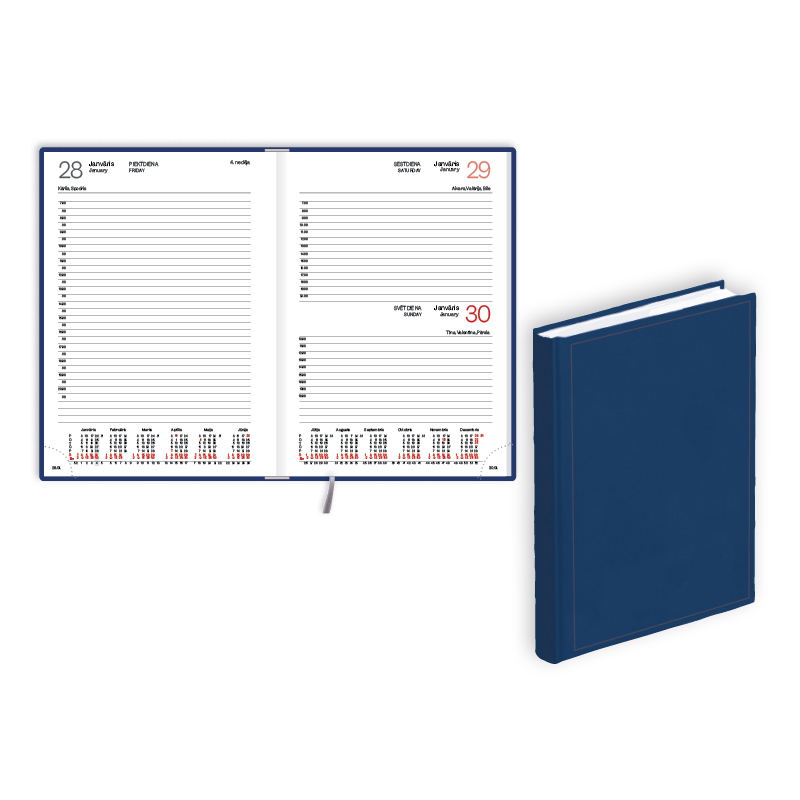 • Izmērs:142 mm x 205 mm • Viena diena lappusē • Divās valodās (latviešu, angļu) • FSC sertificēts papīrs, stūru perforācija • balacron materiālam gadskaitļa uzspiedums uz muguriņas • Latvijas karte pēclapā • Polsterēts priekšējais vāks